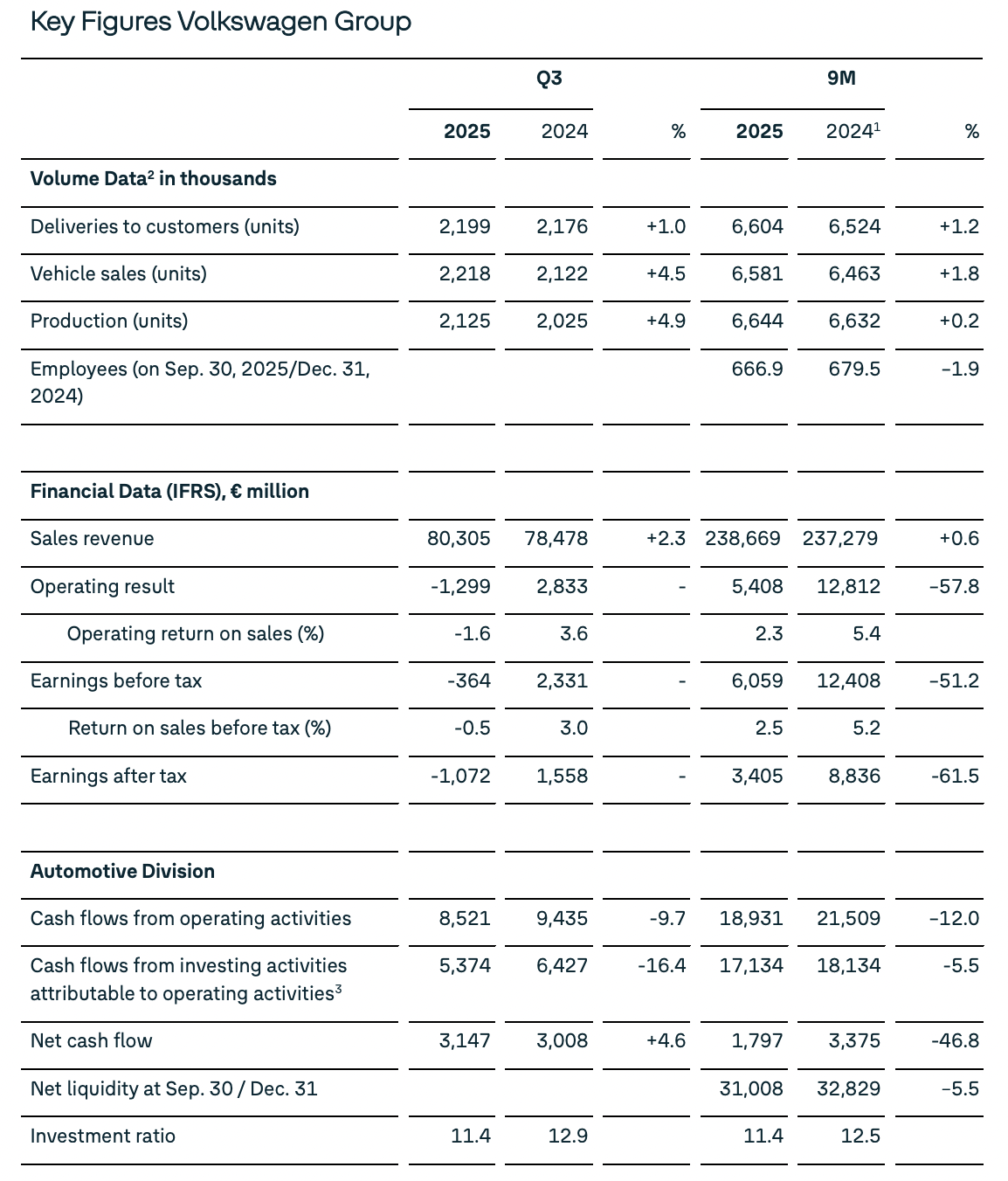 大众汽车三季度核心财务数据 图片来源:大众汽车官网   大众集团首席财务官阿诺·安特利茨(Arno Antlitz)表示,与上年同期相比,业绩明显走弱主要受低利润率的电动车产量增加,以及合计75亿欧元的额外负担影响,其中包括美国进口关税、旗下品牌保时捷的产品战略调整和相关商誉及企业价值减记等。若剔除相关费用,集团前三季度利润率为5.4%。   安特利茨认为,在当前经济环境下,该水平“总体尚可”。另外,美国关税上调以及由此带来的销量下滑,预计全年将对公司造成最高50亿欧元的压力,其负面影响仍将持续。   在大众集团众多品牌中,保时捷的业绩不佳成为拖累集团整体表现的关键因素之一。今年前9个月,保时捷集团营业利润从去年同期的约40亿欧元暴跌99%,至4000万欧元。第三季度,保时捷经营亏损更是达9.66亿欧元。   保时捷利润的大幅下滑,主要源于其电动化战略的调整。2022年,保时捷曾高调宣布“2030年纯电车型占比超80%”,但今年9月又宣布重回内燃机(ICE),产品规划从全面电动化转向内燃机、插混、纯电三线并举。这一战略路线的变更,直接带来了高达18亿欧元的巨额支出。   此外,保时捷内部裁员等组织重组以及取消独立的电池领域业务投资,也带来了10亿欧元的额外支出。仅前三季度,保时捷因重组产生的特殊支出已达27亿欧元,预计2025财年与战略重组相关的总成本将达到约31亿欧元。   2025年第三季度,大众汽车集团共交付汽车219.9万辆,同比增长1.0%。从区域市场来看,表现各有不同。西欧、中欧和东欧以及南美洲市场处于增长态势,北美洲市场销量则同比下滑9.8%,为24.69万辆。   中国作为大众汽车的重要市场,第三季度销量为66.03万辆,同比下滑7.2%。随着中国自主品牌车企在新能源汽车领域凭借性价比优势、先进的电池技术和智能化配置迅速崛起,大众汽车在产品价格、智能化水平等方面的优势不再明显,市场份额逐步被挤压。   面对当前的业绩困境,安特利茨表示,大众将“严格执行”节约措施并对新方法保持开放,重点将放在有针对性地利用规模优势和更有效地挖掘集团内部协同效应。   大众汽车集团预计其2025年的销售收入将与上一年持平。集团的营业销售回报率预计在2.0%至3.0%之间。 |