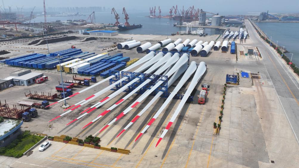 在山东港口烟台港蓬莱港公司码头堆放的风电设备。新华社记者李紫恒 摄