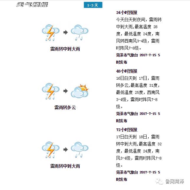 早上5时,菏泽气象台也发布了最新天气情况,今天白天到夜间,雷雨转中到大雨。16日白天到17日,雷雨转多云,17日白天到18日,雷雨转中到大雨。